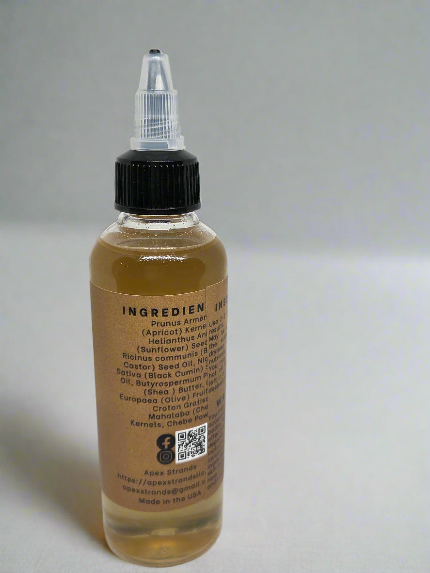 Ingredients: Prunus Armeniaca (Apricot) Kernel Oil, Helianthus Annuus (Sunflower) Seed Oil, Ricinus communis (Black Castor) Seed Oil, Nigella Sativa (Black Cumin) Seed Oil, Butyrospermum Parkii (Shea ) Butter, Olea Europaea (Olive) Fruit Oil, Croton Gratissima Mahalaba (Cherry) Kernels, Chebe Powder.