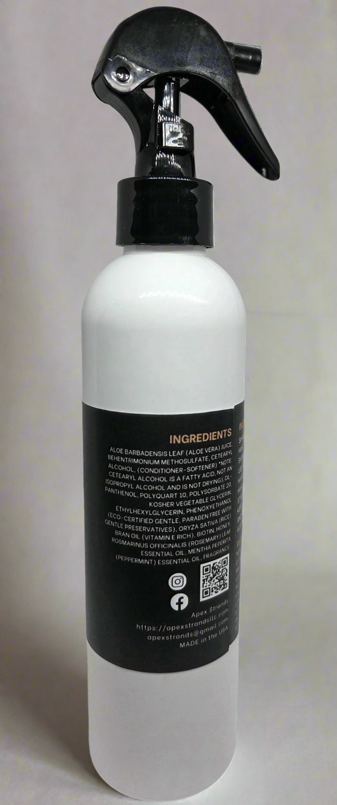 Ingredients: Aloe barbadensis leaf (Aloe Vera) Juice, Behentrimonium Methosulfate, Cetearyl Alcohol, (conditioner-softener) *Note: Cetearyl Alcohol is a fatty acid, not an isopropyl alcohol and is not drying), dl-Panthenol, Polyquart 10, Polysorbate; Kosher Vegetable Glycerin, Ethylhexylglycerin, Phenoxyethanol (Eco-certified gentle, paraben free with gentle preservatives), Oryza Sativa (Rice) Bran Oil (Vitamin E Rich), Biotin; Honey, Rosmarinus officinalis (Rosemary) Leaf Essential Oil, Mentha peperita (Peppermint) Essential Oil, Fragrance.